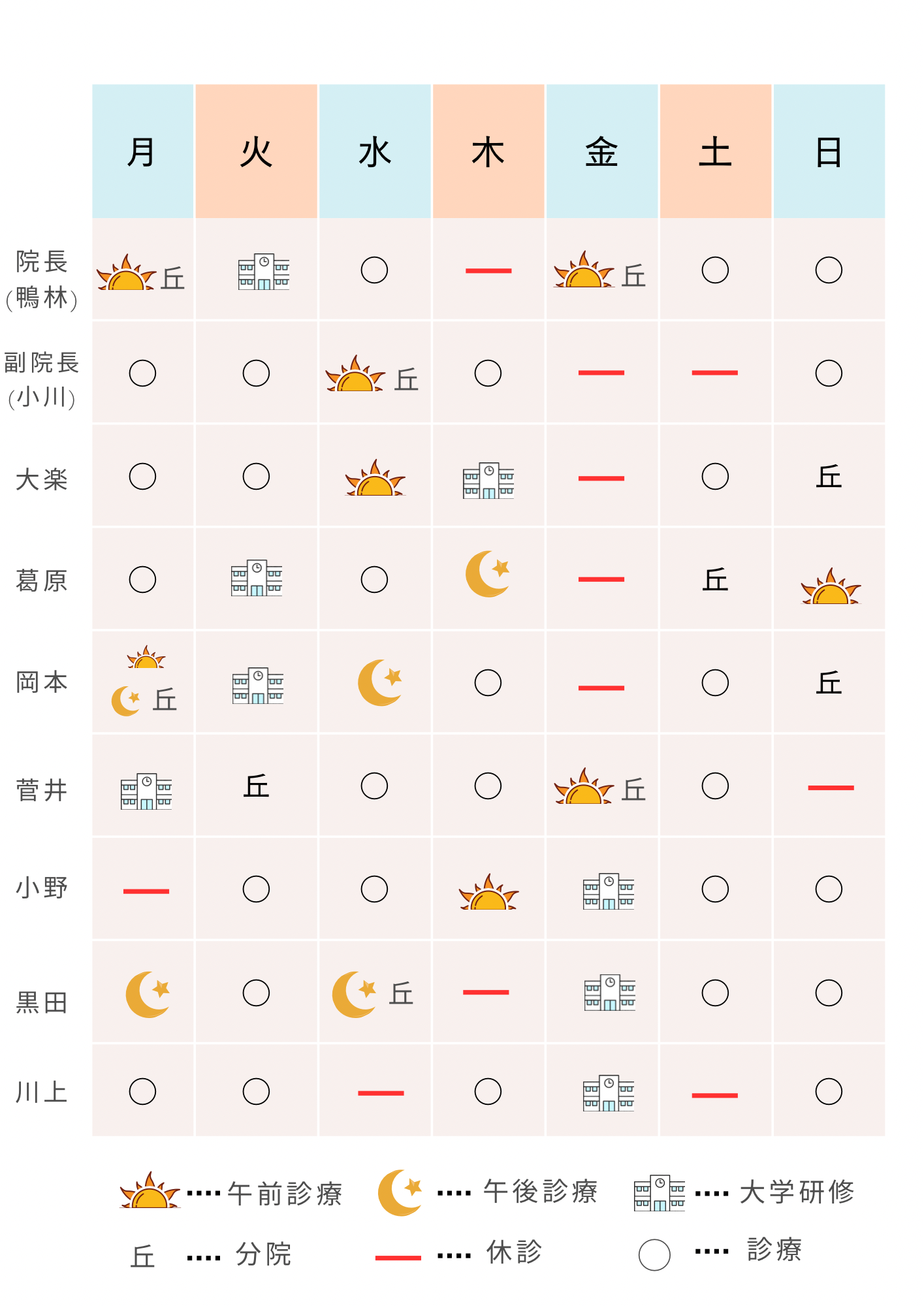 | 診療時間 | 月 | 火 | 水 | 木 | 金 | 土 | 日・祝 |
